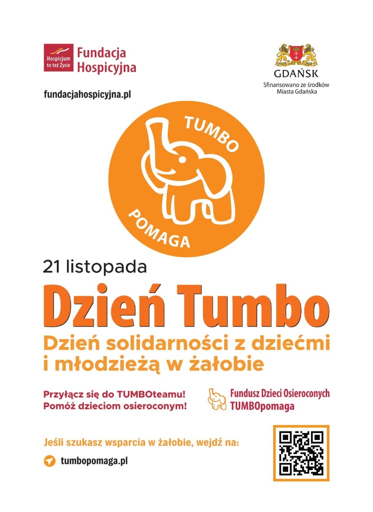 Dzień Tumbo jest organizowany przez Fundację Hospicyjną, a realizowany przez przedszkola i szkoły w całej Polsce! Zachęcamy do zapoznania się z treściami przebiegu żałoby u dzieci i nastolatków na portalu www.tumbopomaga.pl oraz do wsparcia Fundacji Hospicyjnej, która na co dzień prowadzi Hospicjum im. ks. E. Dutkiewicza w Gdańsku oraz pomoc psychologiczną dla osieroconych.