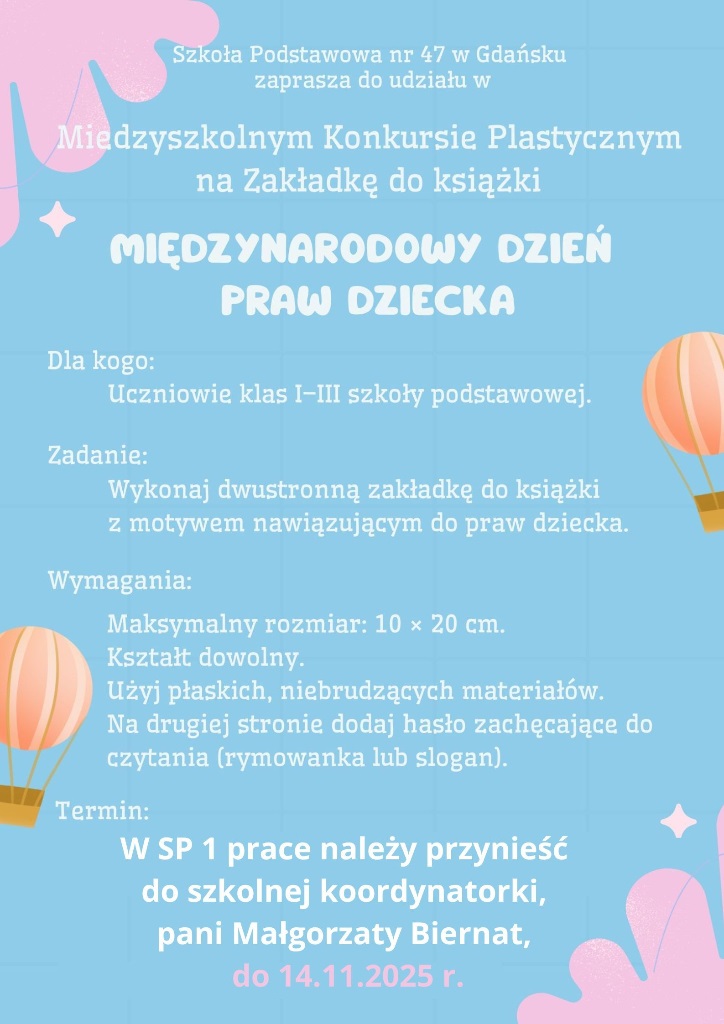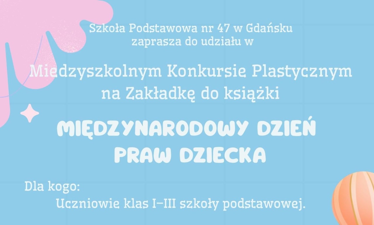 - wykonanie dwustronnej zakładki do książki z motywem nawiązującym do tematu konkursu: Międzynarodowy Dzień Praw Dziecka;